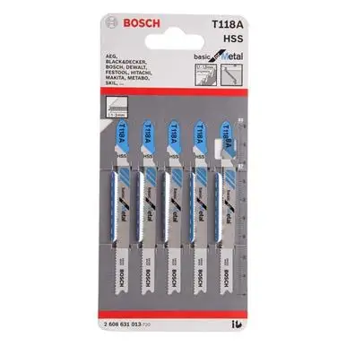 The T118A Basic for Metal Jigsaw Blade makes straight cuts in metal. Its milled, wavy-set teeth are ideal for cuts without special requirements. The fully hardened, high-grade HSS (high-speed steel) blade material is appropriate for cutting standard-strength, non-perforated metal sheets. Additionally, the blade’s very fine progressive tooth pitch (1.1-1.5 mm) cuts very thin solid sheet metals with 1-3 mm thickness. For use with jigsaws with T-Shank clamping systems. Fits all T-shank jigsaws.